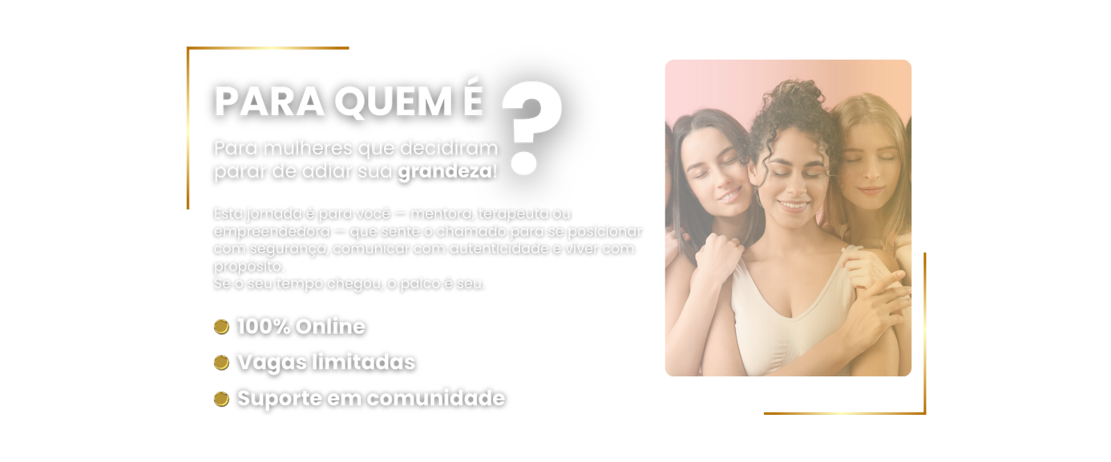 Esta jornada é para você — mentora, terapeuta ou empreendedora — que sente o chamado para se posicionar com segurança, comunicar com autenticidade e viver com propósito.